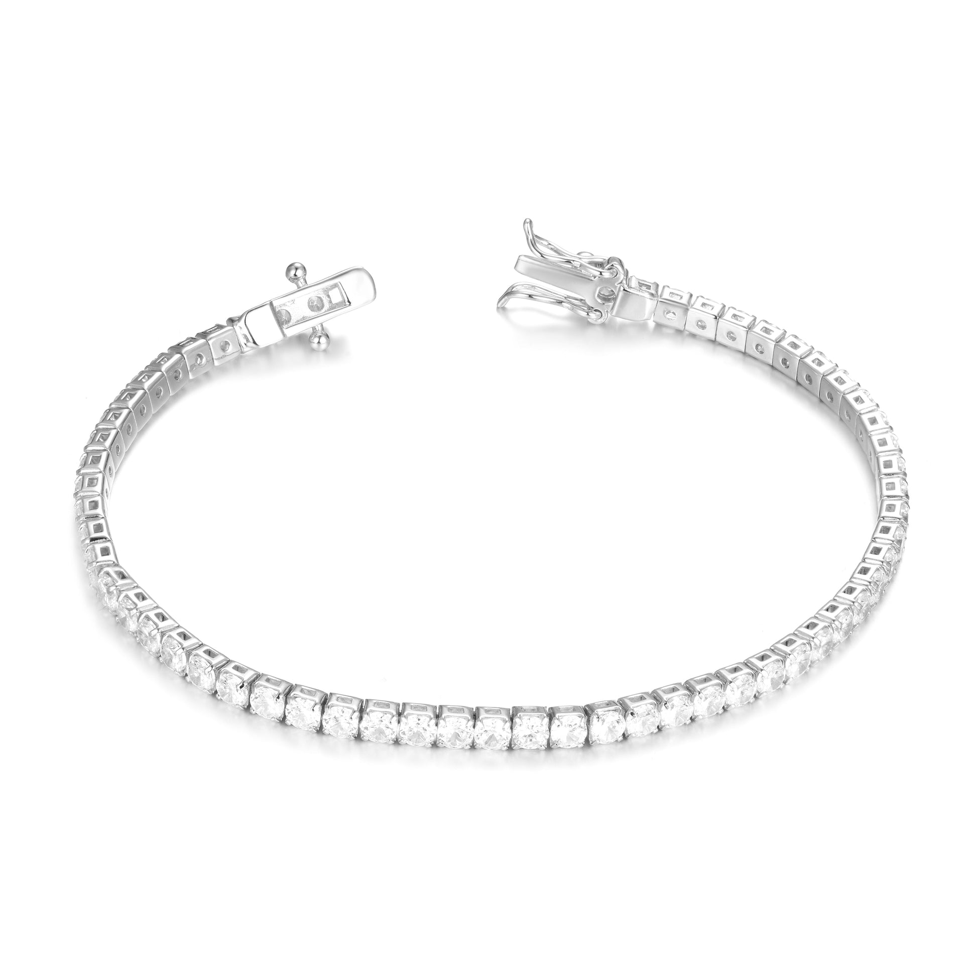 The Magnolia tennis bracelet features a series of round-cut crystals set in individual square-shaped links. The bracelet has a clasp mechanism for secure fastening and is designed for elegant and formal wear, showcasing a continuous line of sparkling crystals that reflect light beautifully.