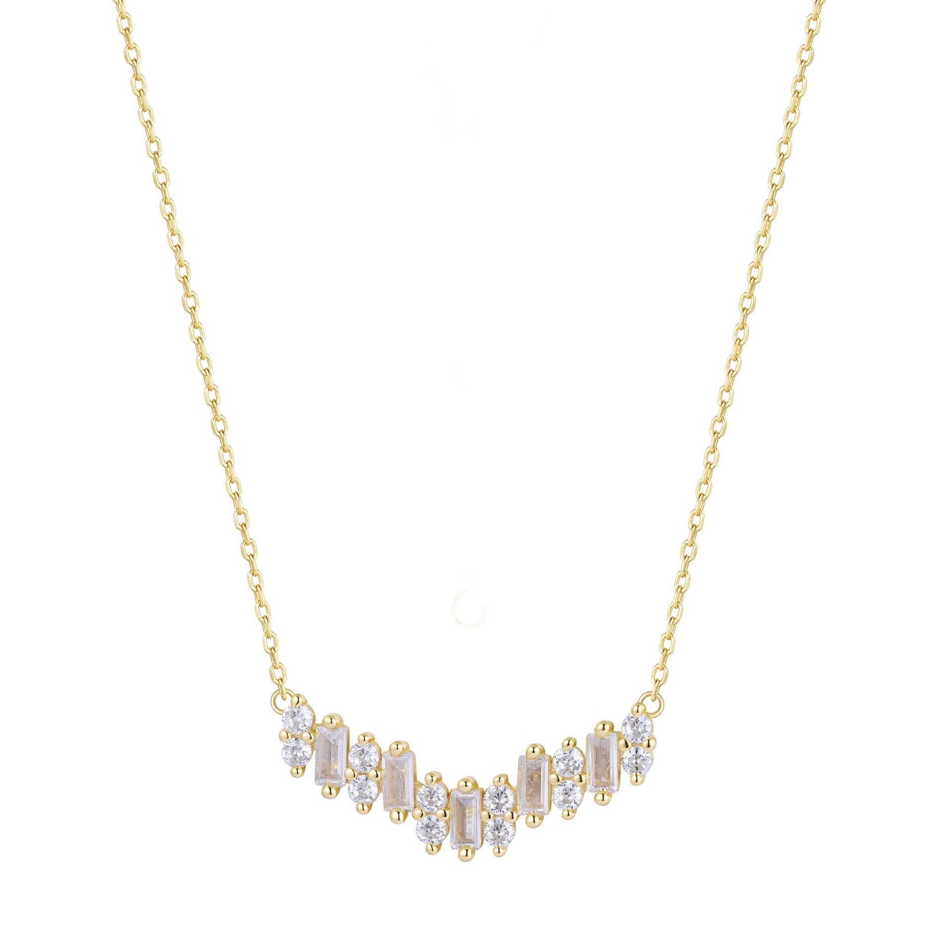This stunning handcrafted necklace features a central design composed of alternating rectangular and round white crystals. The rectangular stones are baguette-cut and set vertically, interspersed with clusters of smaller round crystals. The arrangement creates a gentle, symmetrical curve, giving the necklace an elegant and modern look.